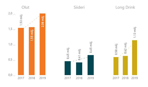 Oluen, siiderin ja long drink -juomien osalta myös tuodut juomamäärät matkaseuruetta kohden kasvoivat vuoden takaisesta. Kun heinäkuussa 2018 olutta tuoneet matkaseurueet toivat keskimäärin 28 litraa olutta, heinäkuussa 2019 määrä oli kasvanut 32 litraan. Siiderin tuontimäärä kasvoi 13 litrasta 14 litraan ja long drink -juomien tuontimäärä 18 litrasta 20 litraan.