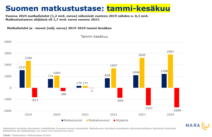 Heikko taloudellinen tilanne on vähentänyt suomalaisten rahankäyttöä kotimaassa. Heikentynyt ostovoima ei ole näkynyt ulkomaanmatkailussa, sillä suomalaiset ovat matkustaneet ahkerasti ulkomaille kuuden ensimmäisen kuukauden aikana. Matkustustaseen[1] alijäämä oli suurempi kuin koskaan, 1,7 miljardia euroa. Suomalaiset käyttivät rahaa ulkomailla ensimmäisen kuuden kuukauden aikana 2,9 miljardia euroa ja ulkomaalaiset Suomessa 1,2 miljardia euroa. Jos kehitys jatkuu tällaisena loppuvuoden, valtio menettää noin miljardi euroa verotuloja verrattuna tilanteeseen, että matkustustase olisi tasapainossa lisääntyneen kotimaanmatkailun ja ulkomailta Suomeen suuntautuvan matkailun seurauksena.