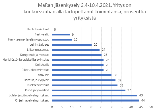 Yhä useampi matkailu- ja ravintola-alan yritys on konkurssiuhan alla (28 prosenttia) verrattuna MaRan maaliskuun alussa tekemään kyselyyn (24 prosenttia). Lopettaneiden osuus (3 prosenttia) on pysynyt samana. Suurin konkurssi- ja lopettamisuhka on ohjelmapalveluissa (44 prosenttia), juhla- ja pitopalveluissa (43 prosenttia), pubeilla ja yökerhoilla (37 prosenttia), ruokaravintoloilla (33 prosenttia) sekä hotelleilla ja kylpylöillä (32 prosenttia).