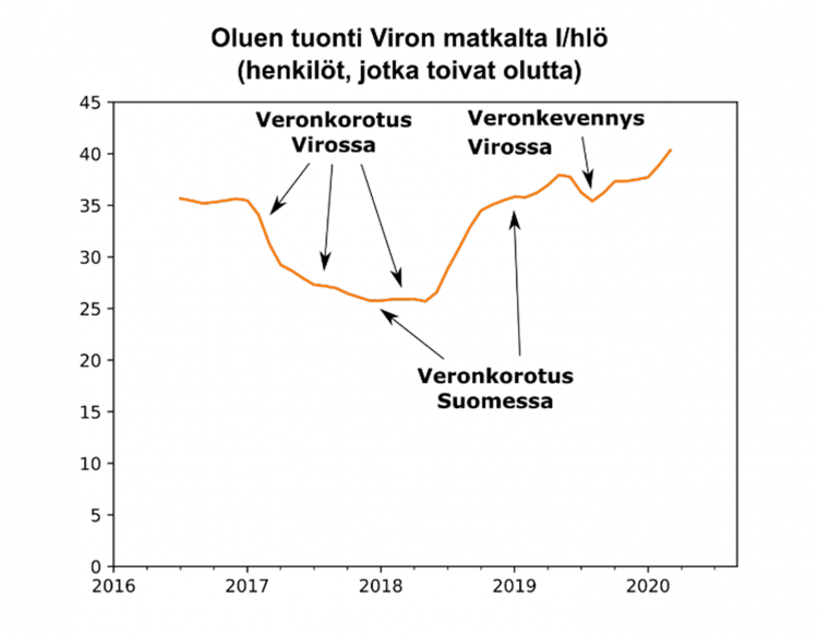 Alkoholiverotuksessa tapahtuneet muutokset näkyvätkin varsin hyvin nimenomaan oluen tuonnissa. Kolme veronkorotusta Virossa vuonna 2017 vähensivät oluen tuontia, kun taas alkoholiveron korotus Suomessa vuosien 2018 ja 2019 alussa sekä Viron tekemä veronkevennys kesällä 2019 käänsivät oluen tuonnin nousuun.
