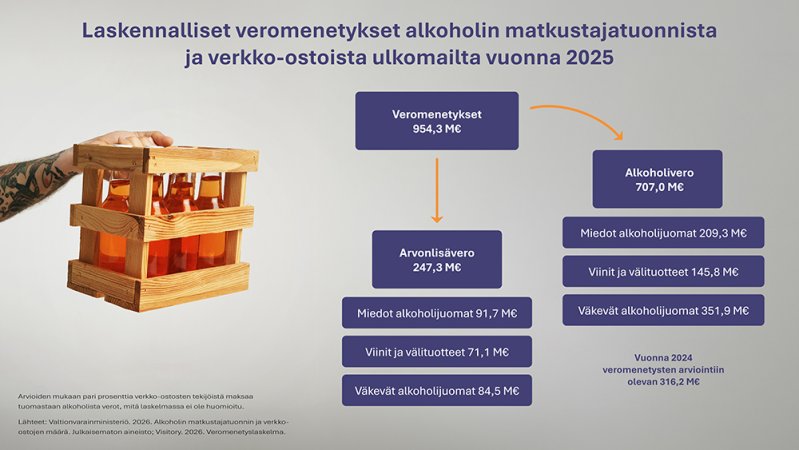 Suomen valtiolle koituu vuosittain yli 950 miljoonaan euron laskennalliset verotulomenetykset, kun suomalaiset suuntaavat alkoholiostoksille Viroon, Ruotsiin ja ulkomaisiin verkkokauppoihin. Tuoreimmat luvut osoittavat, että jatkuvat alkoholiveron korotukset eivät täytä valtion kassaa, vaan romuttavat kotimaista veropohjaa ja elinkeinoelämää.