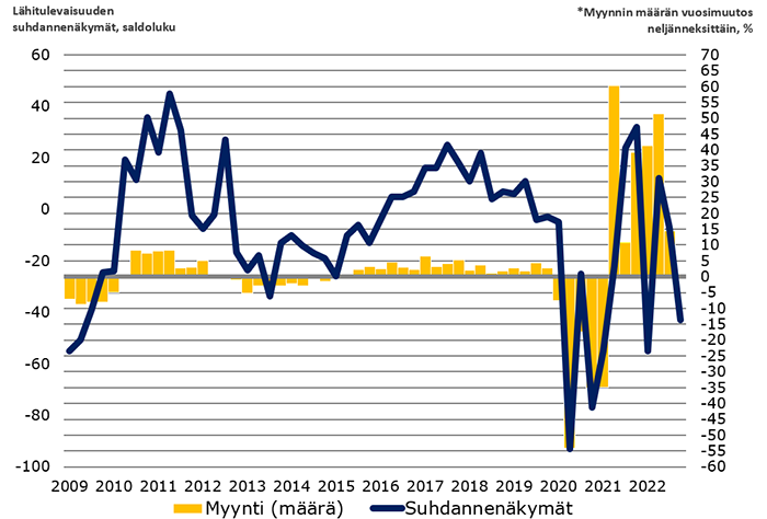 Alan suhdannenäkymissä oli keväällä pientä toiveikkuutta, mutta syksyllä odotukset kääntyivät jyrkkään laskuun. Lokakuussa näkymien saldoluku oli -43, kun se heinäkuussa oli -7. Paranevia suhdanteita lähitulevaisuudelle odotti lokakuussa 8 prosenttia vastaajista. 51 prosenttia ennakoi tilanteen heikkenevän.
