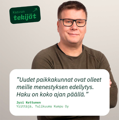 – Etsimme koko ajan uusia mahdollisuuksia ja yleensä ne tulevat verkostojen kautta. Uudet paikkakunnat ovat olleet meille menestyksen edellytys. Tilanne elää paikkakunnittain joskus nopeastikin, mutta toimiminen usealla paikkakunnalla tasaa riskiä, Kettunen tiivistää Tulikuuman Kummun idean.