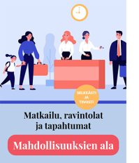Mahdollisuuksien ala -selkoesite esittelee matkailu- ravintola- ja tapahtuma-aloja helpolla selkokielellä. Esitteelle on myönnetty Selkokeskuksen selkotunnus.