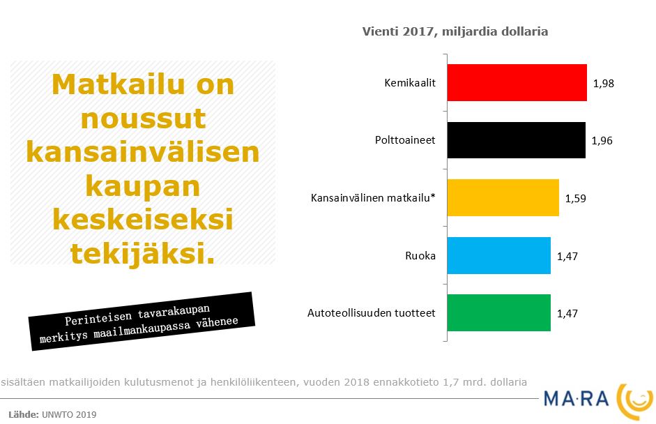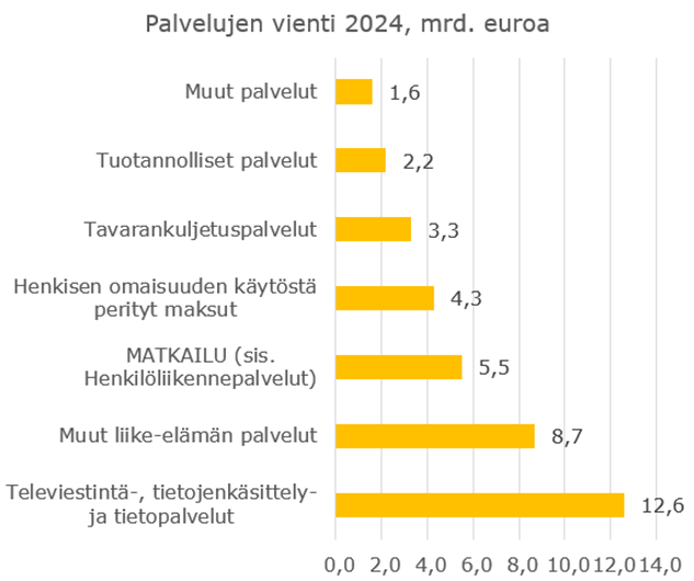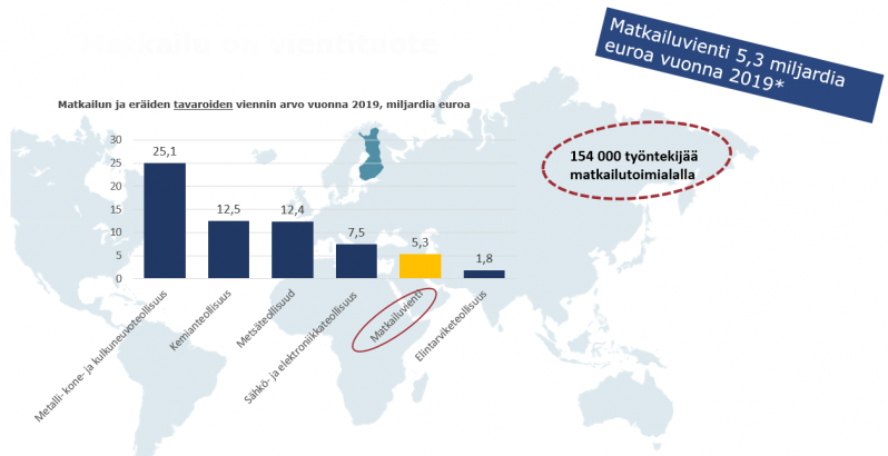 Matkailu on ainoa vientiala, joka maksaa Suomeen myös arvonlisäveron. Henkilöliikenteen sisältävä matkailuvienti oli 5,5 miljardia euroa vuonna 2024.