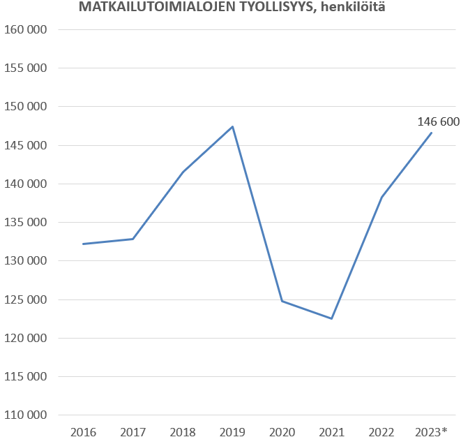 Matkailutoimialat työllistivät vuonna 2023 ympäri Suomen 147 000 henkilöä, mikä on lähes sama määrä kuin ennen pandemiaa. Toimialoittain tarkasteltuna puolet matkailun työllisistä on ravitsemistoiminnan alalla ja noin kymmenys (11 %) on majoitustoiminnan alalla.