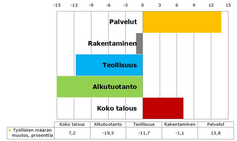 Palvelualojen painoarvo työllistäjänä kasvaa. Työmarkkinat ovat olleet rakennemuutoksen kourissa koko 2000-luvun ja sama kehitys jatkuu edelleen. Samaan aikaan kun työpaikkoja on vähentynyt muilta aloilta, palveluihin on tullut lisää työpaikkoja.