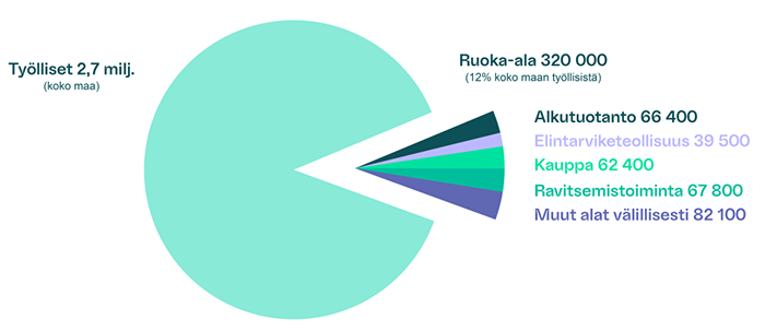 Ravitsemisala ovat merkittävä työllistäjä. Ruoka-ala työllistää yhteensä 320 000 henkeä, mikä on 12 prosenttia koko maan työllisistä. Ravitsemisala on ruoka-alan suurin yksittäinen työllistäjä (21 %) (Luonnonvarakeskus, 2024).