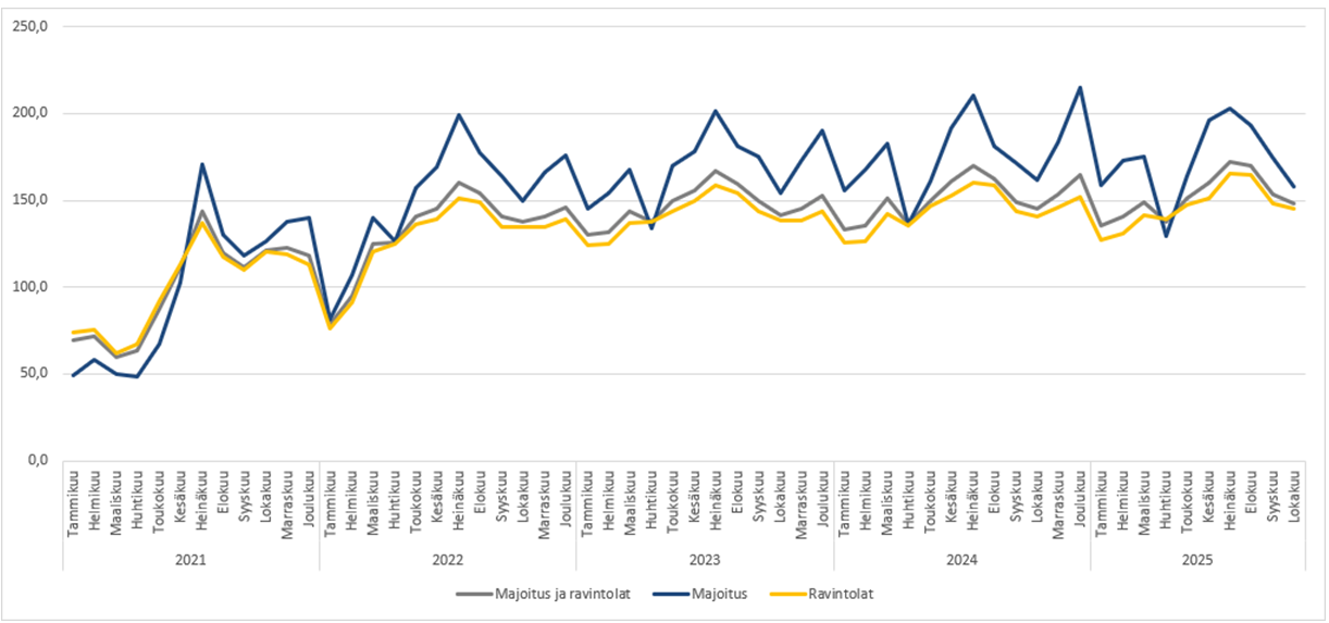 Tilastokeskuksen ennakkotiedon mukaan ravitsemistoiminnan liikevaihto nousi vuoden 2025 lokakuussa 3,5 prosenttia edellisvuoden lokakuuhun verrattuna. Vastaavasti majoitustoiminnan liikevaihto laski -2,3 prosenttia.