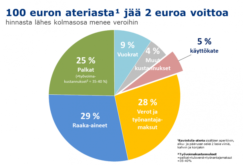 Sadan euron hintaisesta illallisesta jää yritykselle voittoa keskimäärin 2 euroa verojen ja muiden maksujen jälkeen.